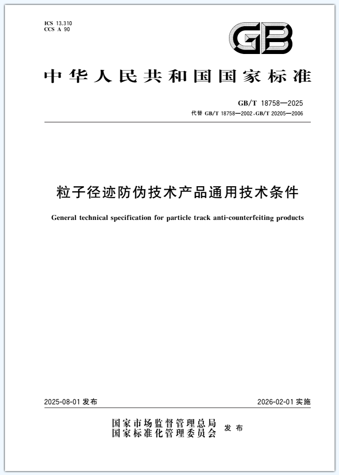 本文件规定了粒子径迹防伪技术产品的规定了一般要求、外观要求、防伪性能、识别性能等技术要求、检验规则,描述了相应的试验方法。 本文件适用于各类粒子径迹防伪技术产品的设计、生产和检验。