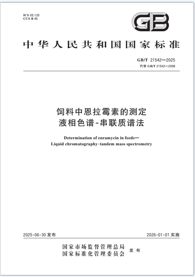 本文件描述了饲料中恩拉霉素的液相色谱⁃串联质谱测定方法。 本文件适用于配合饲料、浓缩饲料、精料补充料、添加剂预混合饲料和混合型饲料添加剂中恩拉霉素(以恩拉霉素A和恩拉霉素B之和计)的测定。 本文件恩拉霉素A 和恩拉霉素B 的检出限均为0.05 mg/kg,定量限均为0.10 mg/kg。